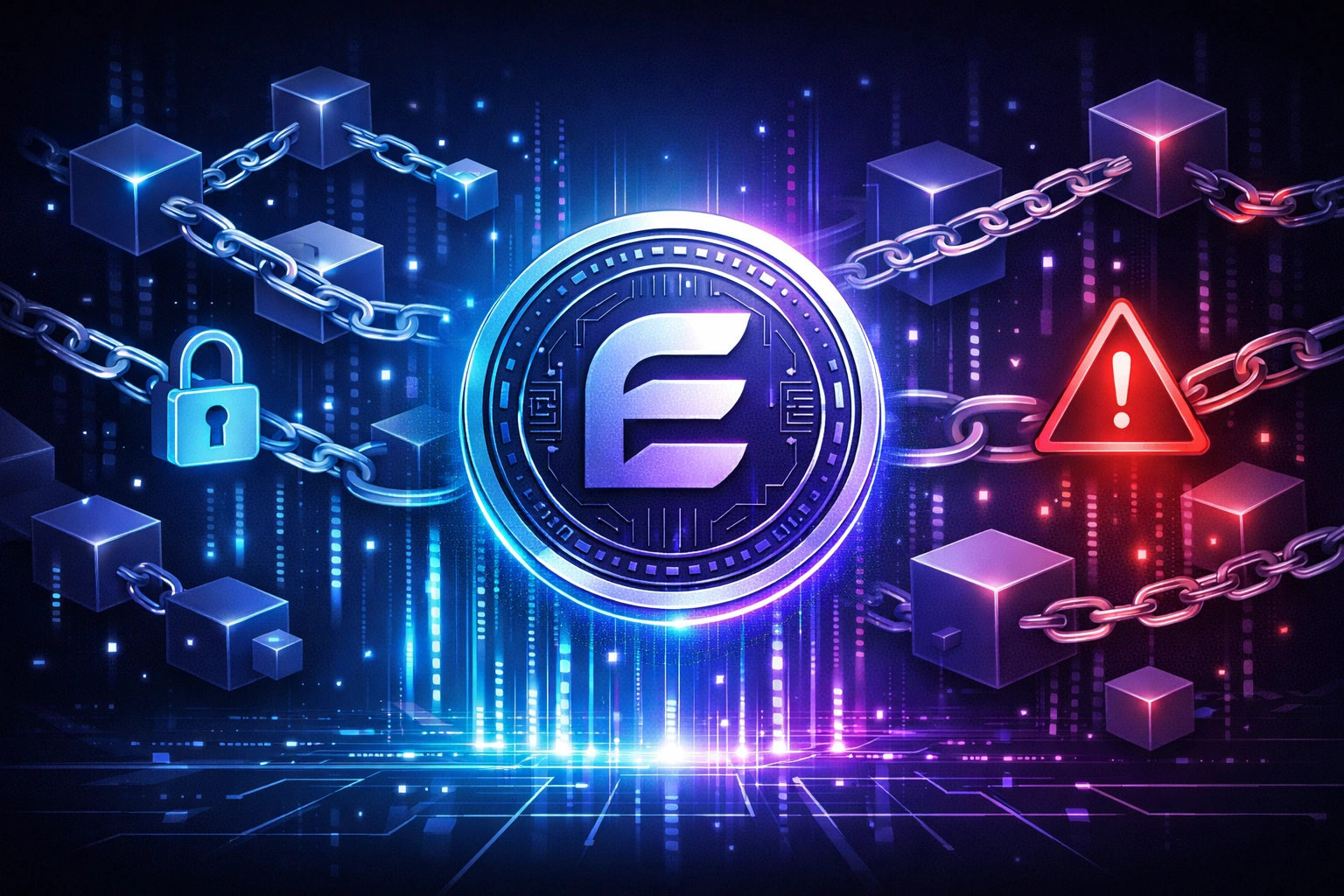 Futuristic crypto illustration showing a glowing digital coin, blockchain chains, security lock, and warning symbol.