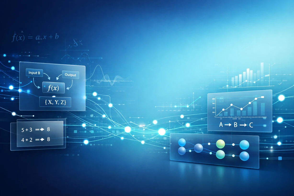 Abstract blue tech interface showing formulas, data flows, and charts illustrating function process.